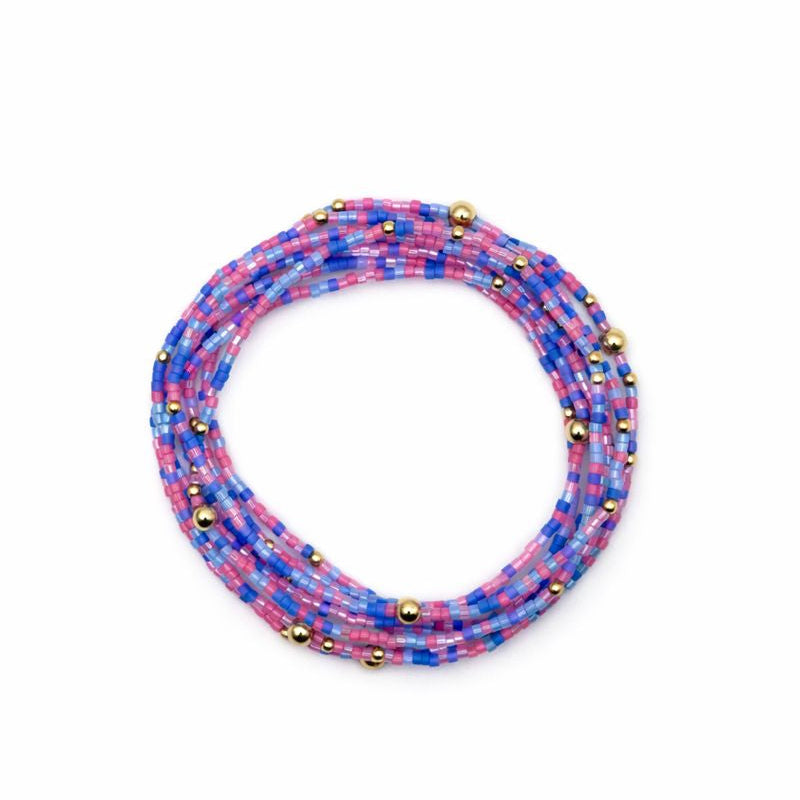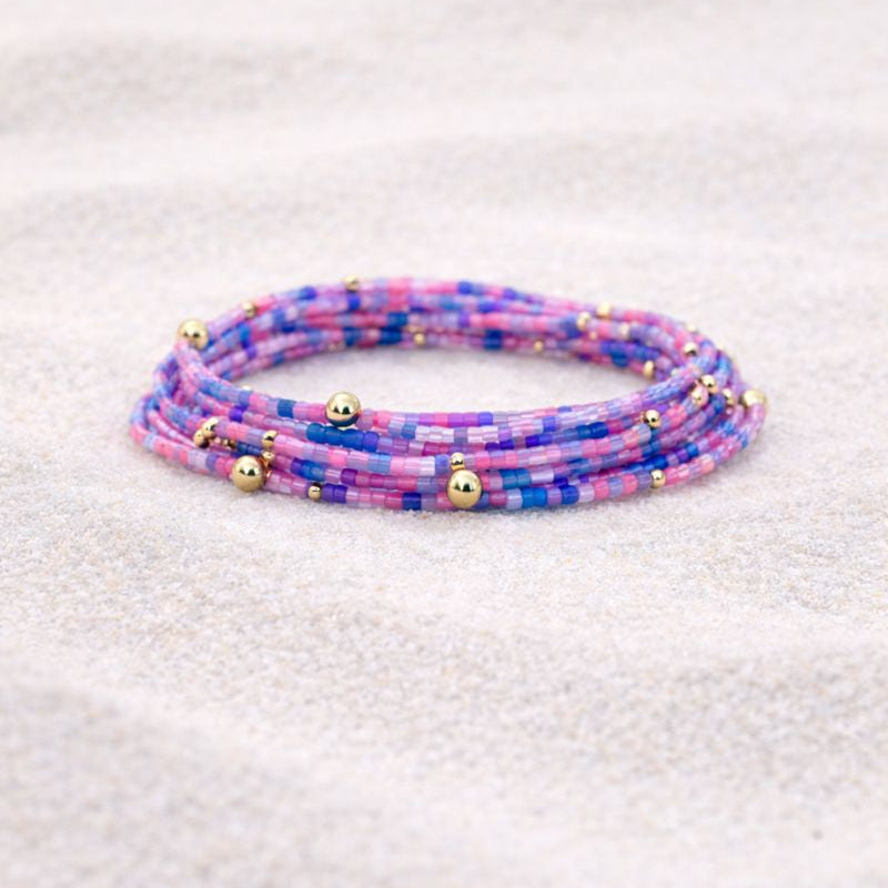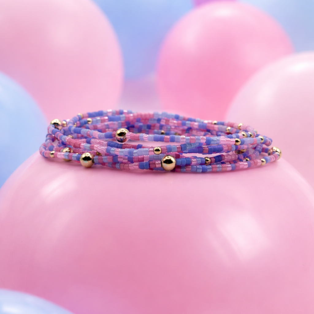 Playful, colorful, and made to stack — the Erika Gold Bracelet adds a burst of pastel joy to any look. Featuring soft pink, purple and blue seed beads with delicate gold accents, this bracelet is lightweight, fun, and perfect for everyday wear.