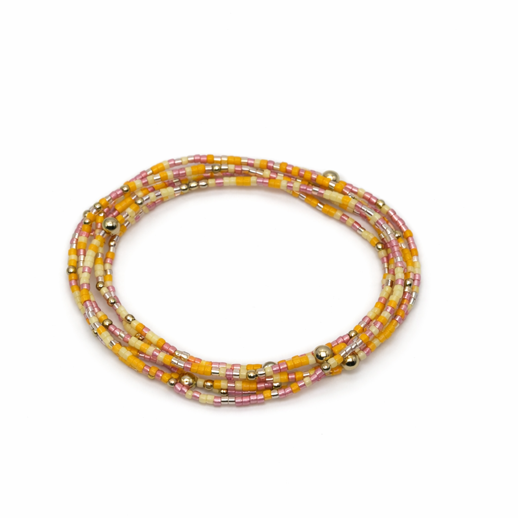 Bright, fresh, and effortlessly wearable — Citrus Twist is inspired by golden mornings and sunlit windowsills. A soft mix of pink, lemon, and warm citrus beads is balanced with delicate gold accents for just the right hint of glow.